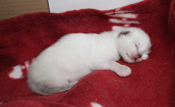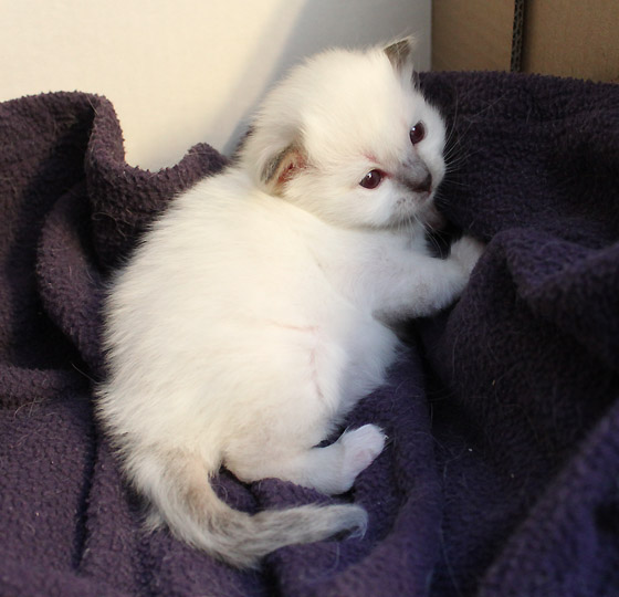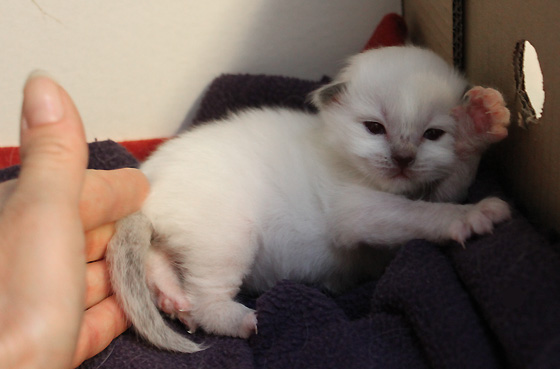 Bébé Griffe, 17 jours Cette adorable chatonne commence à explorer le carton et ne veut absolument pas être biberonnée ! Magnifique petite princesse !