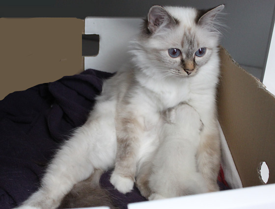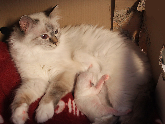 Le lait est revenu ! La petite s'excite ! 8 jours Rien à faire, Bérénice ramène toujours la petite dans son carton tout déchiqueté ! Griffe d'Or (J 8) pesait 190g le matin et avoisine les 200g le soir suite à une nouvelle montée de lait de Ninice ! Ses yeux vont bientôt s'ouvrir...
